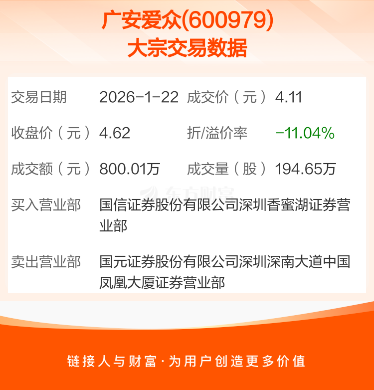 2026年1月22日,广安爱众发生1笔大宗交易,共成交194.65万股,成交金额800.01万元,占其流通市值比例为0.14%。