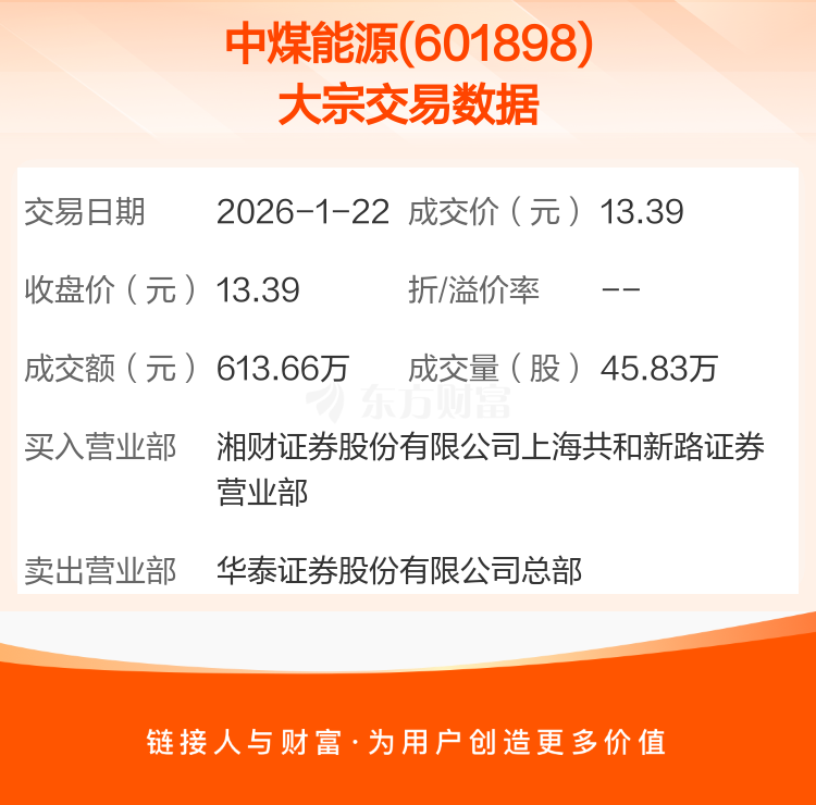 2026年1月22日,中煤能源发生1笔大宗交易,共成交45.83万股,成交金额613.66万元。