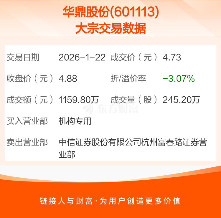 2026年1月22日,华鼎股份发生1笔大宗交易,共成交245.20万股,成交金额1159.80万元,占其流通市值比例为0.22%。