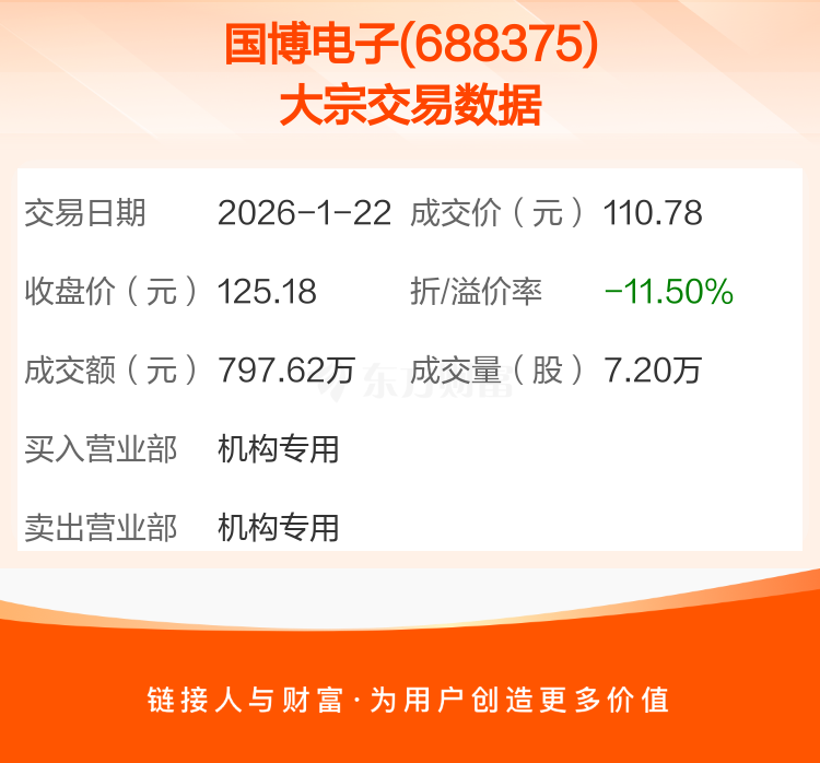 2026年1月22日,国博电子发生1笔大宗交易,共成交7.20万股,成交金额797.62万元,占其流通市值比例为0.01%。