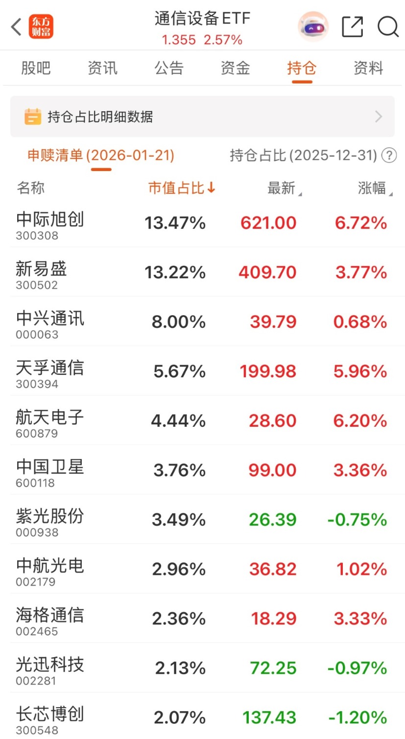 通信ETF(515880),跟踪中证全指通信设备指数,基金通过完全复制法跟踪中证全指通信设备指数,覆盖光模块、服务器、光纤等算力产业链核心标的,光模块相关持仓占比超50%,整体通信设备产业链占比超80%。重仓股包括新易盛、中际旭创、工业富联等通信龙头。数据显示,2025年全年涨幅达125.81%,位列ETF涨幅榜首;近20个交易日日均成交额约14.5亿元,流动性较高。