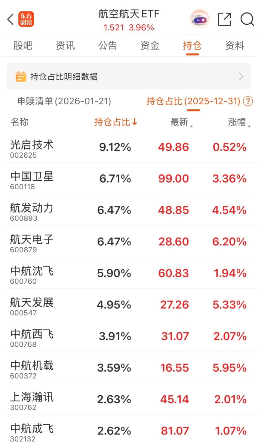 航空航天ETF(159227),跟踪国证航天指数,基金覆盖战斗机、航空发动机、火箭、卫星等全产业链,商业航天概念权重占比约70%,契合“空天一体”战略方向,涵盖大飞机、商业航天、低空经济等新兴领域。今年以来份额增长27.01%,规模增长40.52%。近20个交易日日均成交额达6.54亿元,流动性充足。