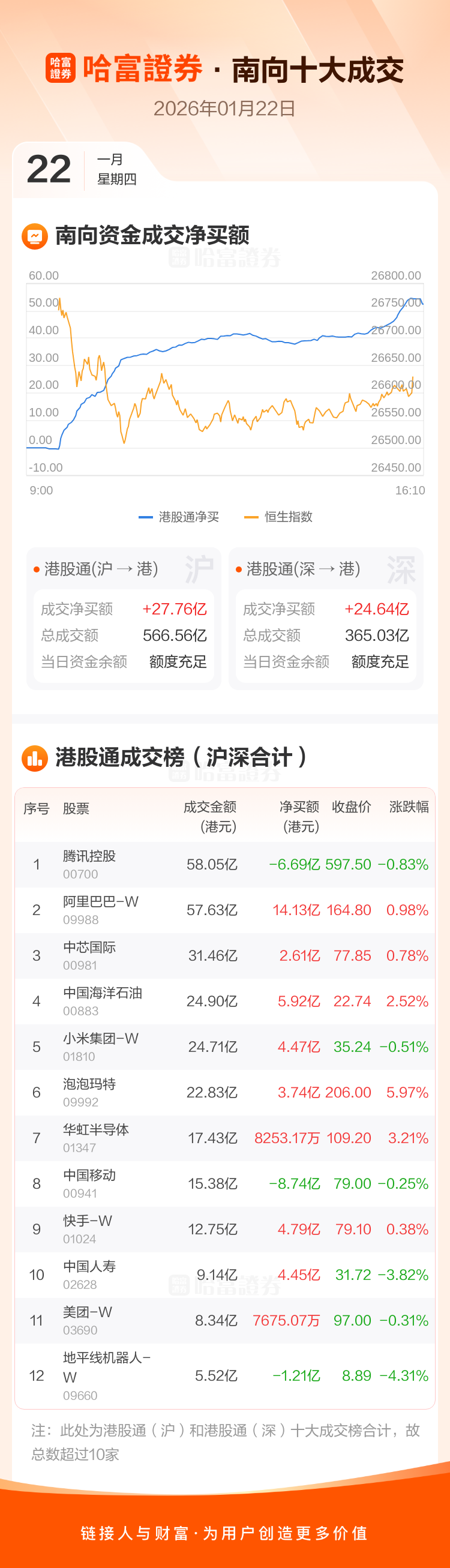 恒生指数1月22日涨0.17%,收报26629.96点。南向资金今日净买入港股52.39亿港元。南向资金今日成交额931.59亿港元,港股大市成交2348.60亿港元。