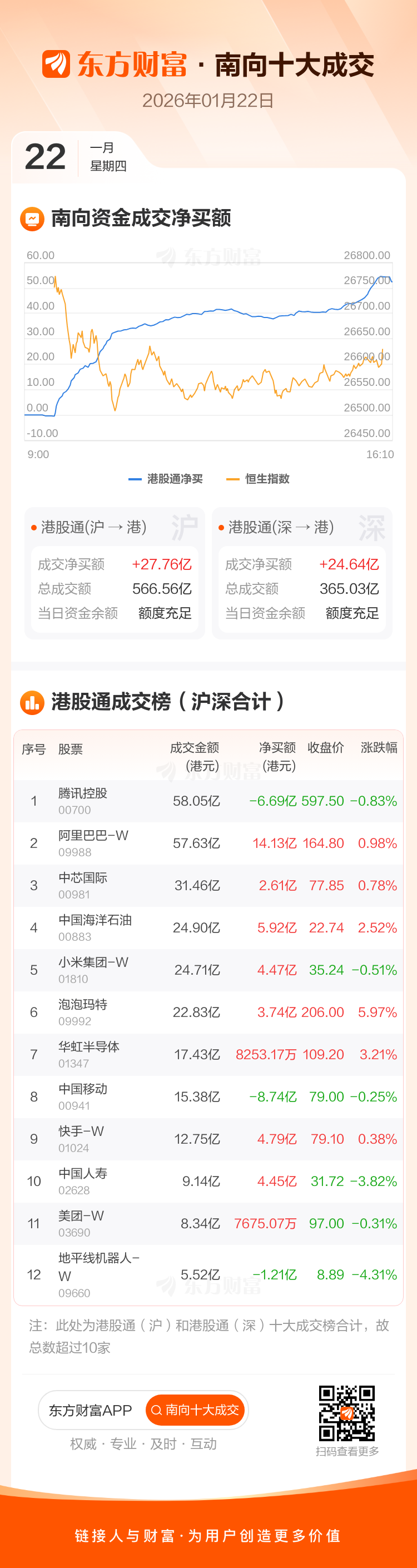 1月22日南向资金净买逾52亿港元,逾14亿抢筹阿里巴巴-W