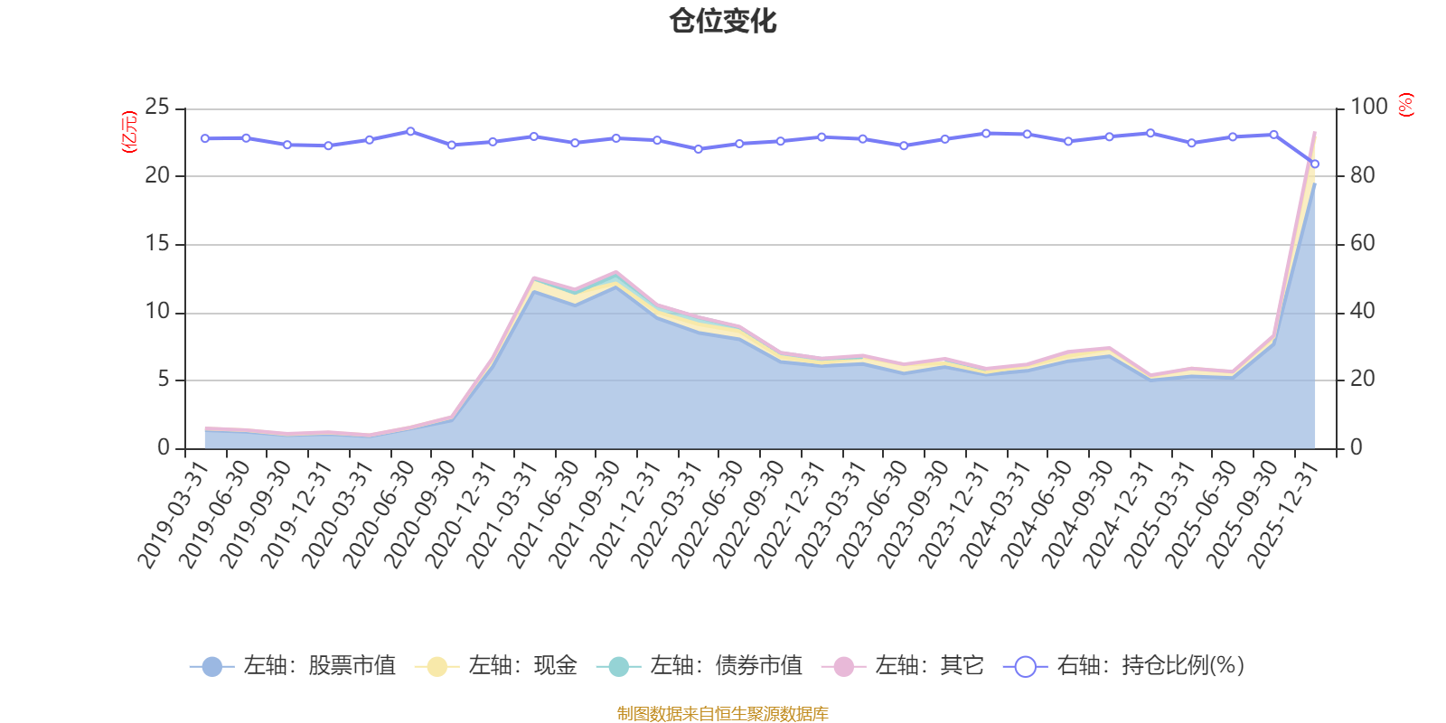 据定期报告数据统计,近三年平均股票仓位为90.71%,同类平均为89.51%。2020年上半年末基金达到93.28%的最高仓位,2025年末最低,为83.69%。