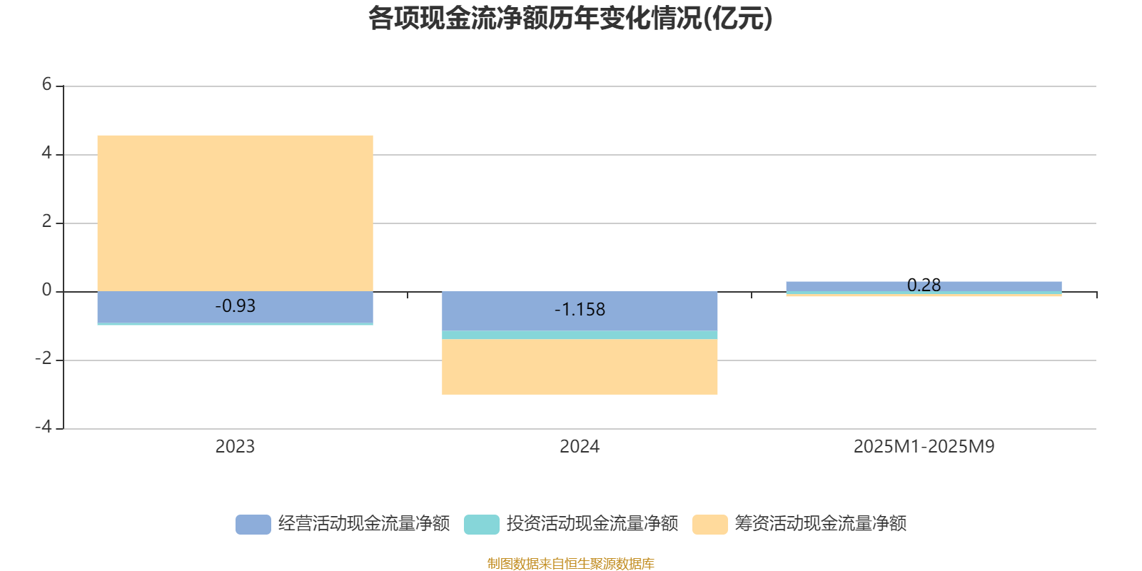 2025年1月至9月,公司经营活动现金流净额为2799万元,同比增加1.91亿元;筹资活动现金流净额-656.5万元,同比增加1.51亿元;投资活动现金流净额-839.2万元,上年同期为-1446.2万元。