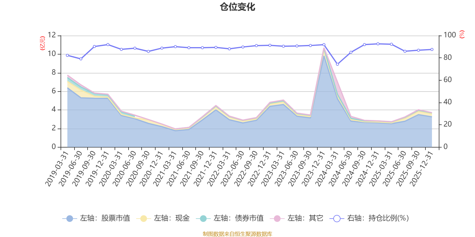 据定期报告数据统计,近三年平均股票仓位为88.35%,同类平均为88.27%。2024年末基金达到92.57%的最高仓位,2024年一季度末最低,为74.27%。