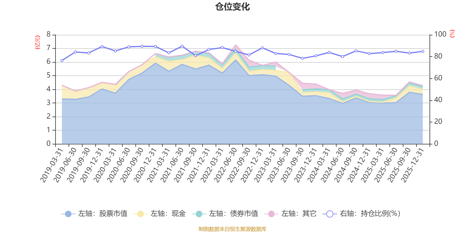 据定期报告数据统计,近三年平均股票仓位为82.73%,同类平均为85.74%。2021年上半年末基金达到89.6%的最高仓位,2019年一季度末最低,为76.45%。