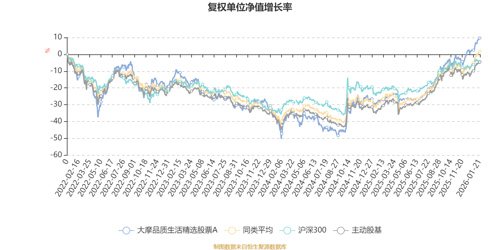 截至1月21日,大摩品质生活精选股票A近三个月复权单位净值增长率为15.29%,位于同类可比基金30/167;近半年复权单位净值增长率为38.60%,位于同类可比基金44/167;近一年复权单位净值增长率为50.63%,位于同类可比基金51/165;近三年复权单位净值增长率为26.22%,位于同类可比基金69/156。