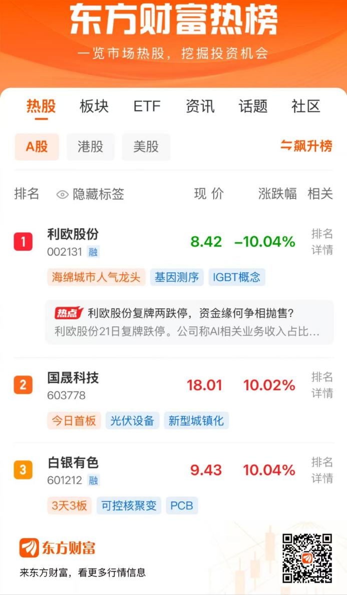 1月22日,两市全天震荡,三大指数均小幅收涨。东方财富热榜前三的股票中,利欧股份位列第1,国晟科技位列第2,白银有色位列第3。