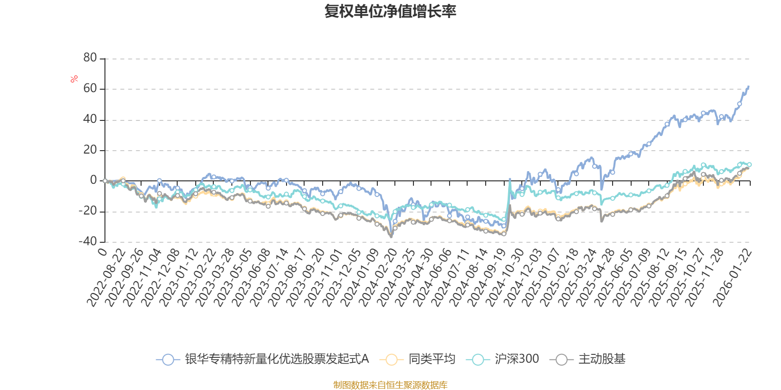 截至1月21日,银华专精特新量化优选股票发起式A近三个月复权单位净值增长率为14.40%,位于同类可比基金31/121;近半年复权单位净值增长率为25.76%,位于同类可比基金58/121;近一年复权单位净值增长率为64.67%,位于同类可比基金14/119;近三年复权单位净值增长率为65.83%,位于同类可比基金5/89。