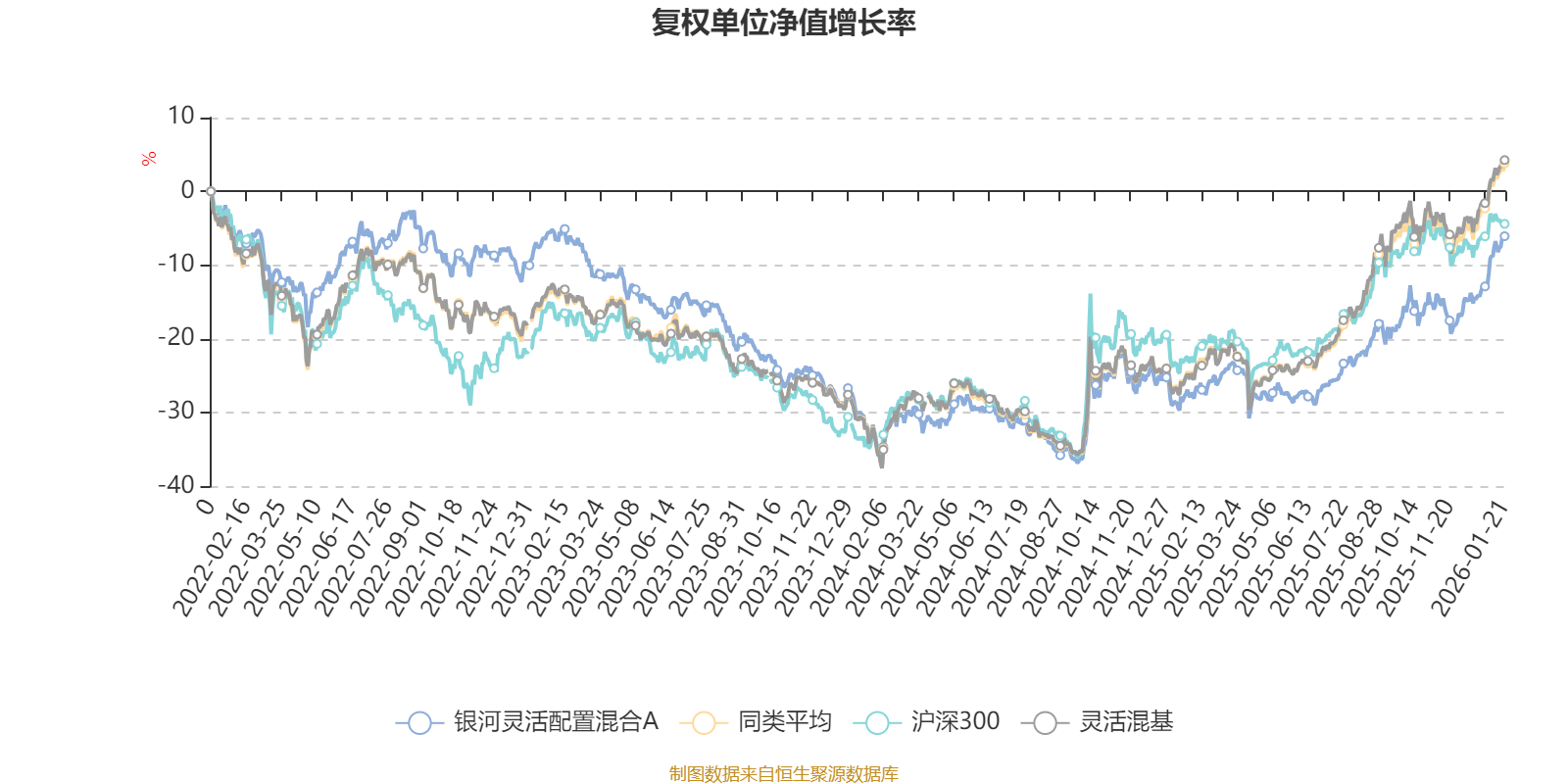 截至1月21日,银河灵活配置混合A近三个月复权单位净值增长率为12.38%,位于同类可比基金373/1286;近半年复权单位净值增长率为23.69%,位于同类可比基金587/1286;近一年复权单位净值增长率为28.45%,位于同类可比基金710/1286;近三年复权单位净值增长率为-0.48%,位于同类可比基金1023/1286。