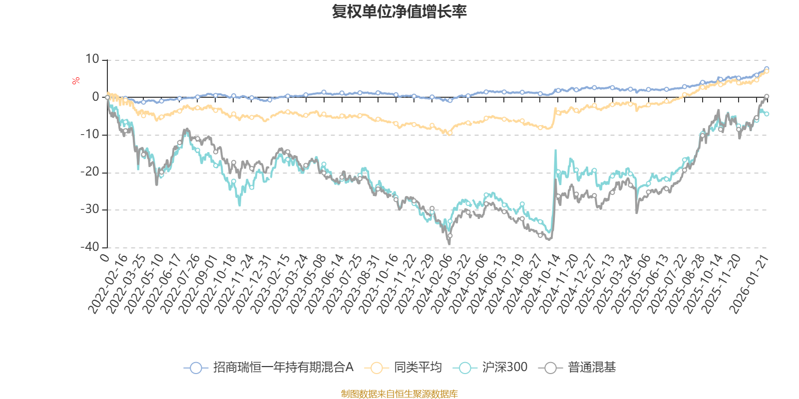 截至1月21日,招商瑞恒一年持有期混合A近三个月复权单位净值增长率为2.82%,位于同类可比基金195/629;近半年复权单位净值增长率为4.73%,位于同类可比基金284/629;近一年复权单位净值增长率为5.07%,位于同类可比基金472/626;近三年复权单位净值增长率为7.56%,位于同类可比基金424/564。