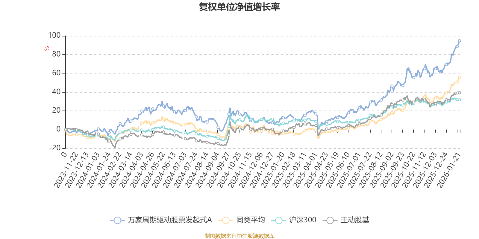 截至1月21日,万家周期驱动股票发起式A近三个月复权单位净值增长率为24.07%,位于同类可比基金5/13;近半年复权单位净值增长率为52.67%,位于同类可比基金5/13;近一年复权单位净值增长率为72.38%,位于同类可比基金4/13。