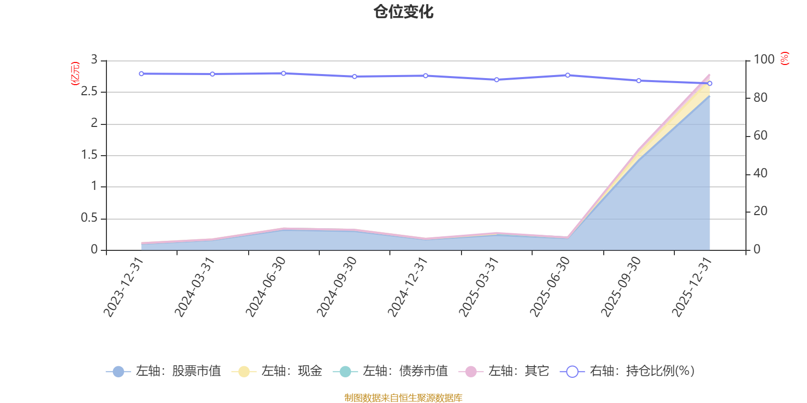 据定期报告数据统计,成立以来平均股票仓位为91.32%,同类平均为89.51%。2024年上半年末基金达到93.2%的最高仓位,2025年末最低,为87.9%。