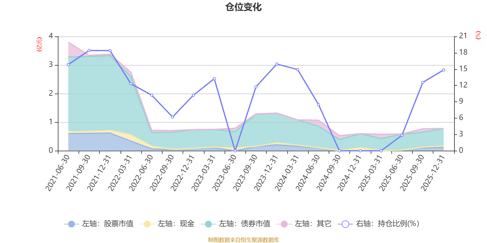据定期报告数据统计,近三年平均股票仓位为7.88%,同类平均为19.2%。2021年三季度末基金达到18.42%的最高仓位,2025年上半年末最低,为2.85%。