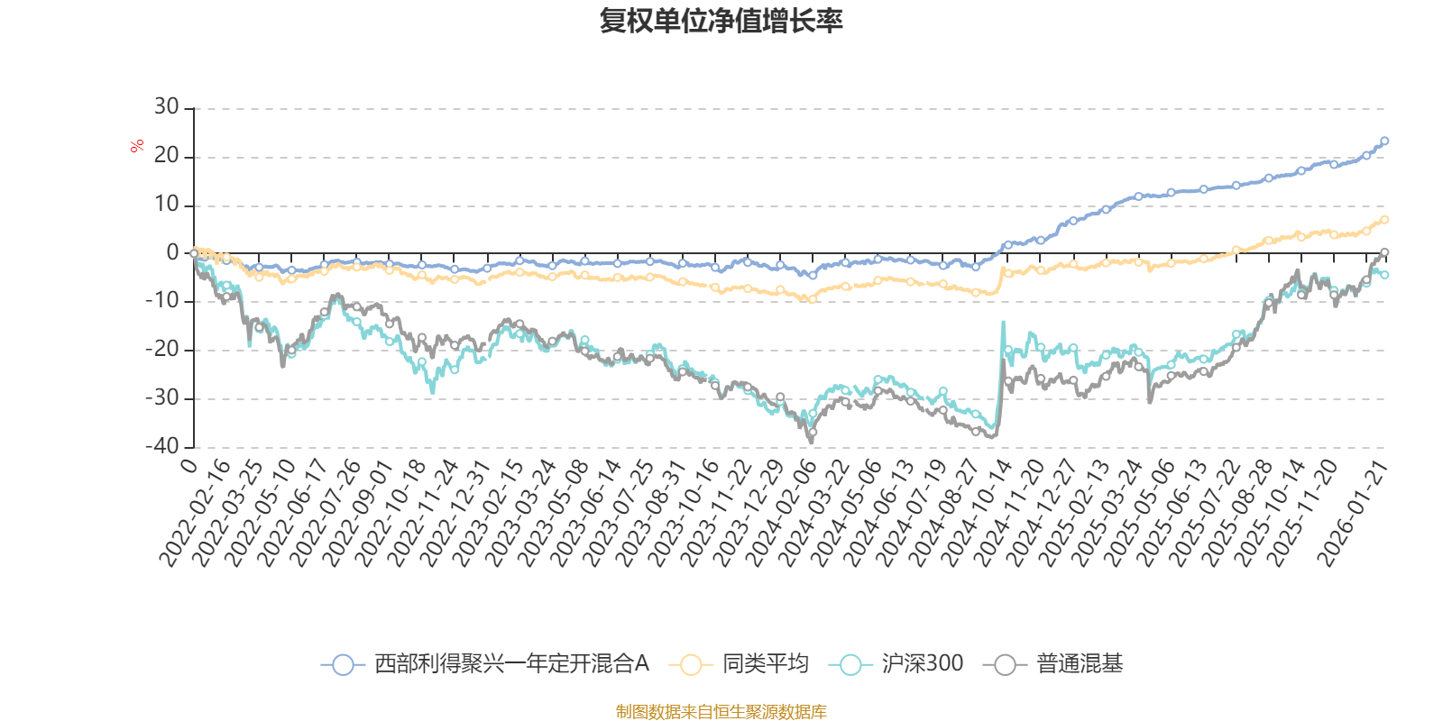 截至1月21日,西部利得聚兴一年定开混合A近三个月复权单位净值增长率为4.93%,位于同类可比基金72/629;近半年复权单位净值增长率为8.14%,位于同类可比基金119/629;近一年复权单位净值增长率为13.82%,位于同类可比基金94/626;近三年复权单位净值增长率为25.80%,位于同类可比基金45/564。