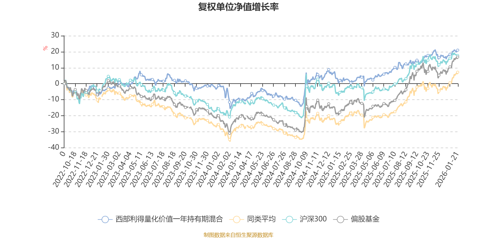 截至1月21日,西部利得量化价值一年持有期混合近三个月复权单位净值增长率为3.15%,位于同类可比基金530/689;近半年复权单位净值增长率为8.89%,位于同类可比基金586/689;近一年复权单位净值增长率为18.81%,位于同类可比基金574/673;近三年复权单位净值增长率为23.72%,位于同类可比基金146/396。