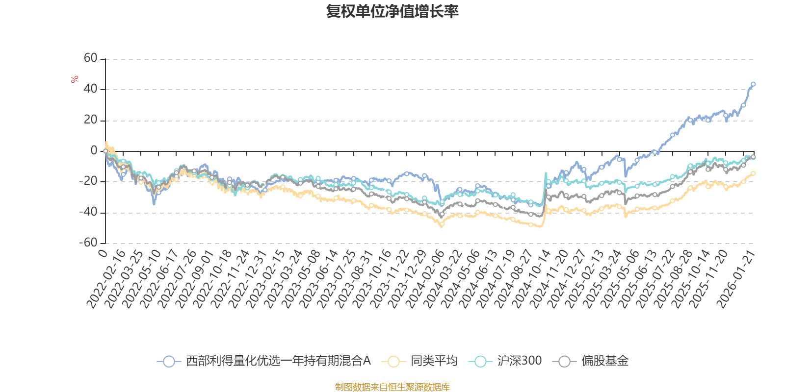 截至1月21日,西部利得量化优选一年持有期混合A近三个月复权单位净值增长率为17.23%,位于同类可比基金57/621;近半年复权单位净值增长率为30.42%,位于同类可比基金214/621;近一年复权单位净值增长率为66.94%,位于同类可比基金64/613;近三年复权单位净值增长率为81.22%,位于同类可比基金23/535。