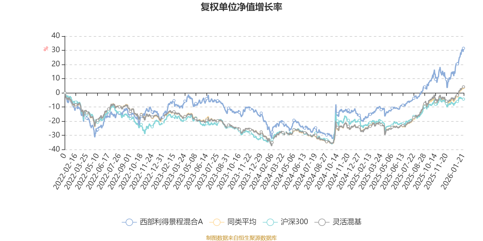 截至1月21日,西部利得景程混合A近三个月复权单位净值增长率为18.21%,位于同类可比基金143/1286;近半年复权单位净值增长率为37.38%,位于同类可比基金300/1286;近一年复权单位净值增长率为57.44%,位于同类可比基金223/1286;近三年复权单位净值增长率为42.49%,位于同类可比基金238/1286。