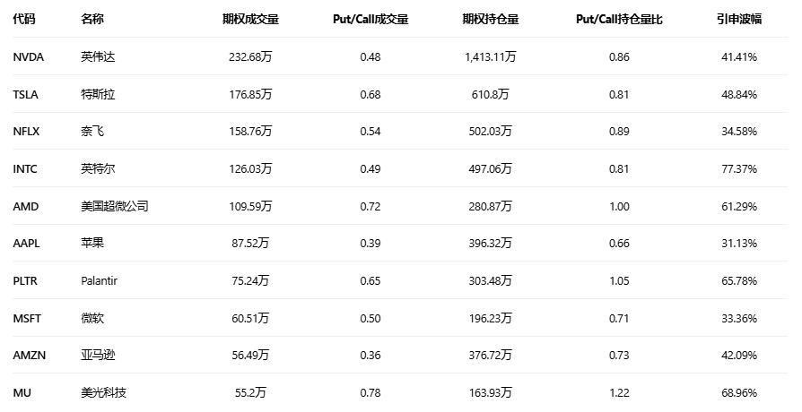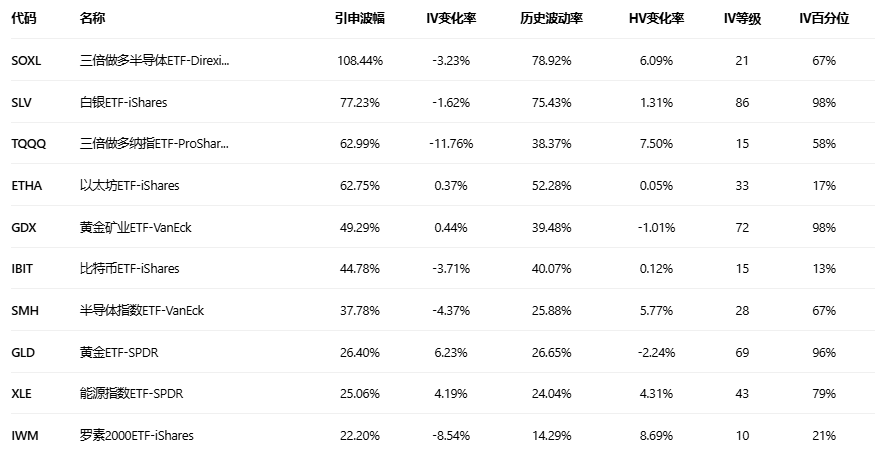 引申波幅排行榜(标的市值>10亿美元,且期权成交量>10万)