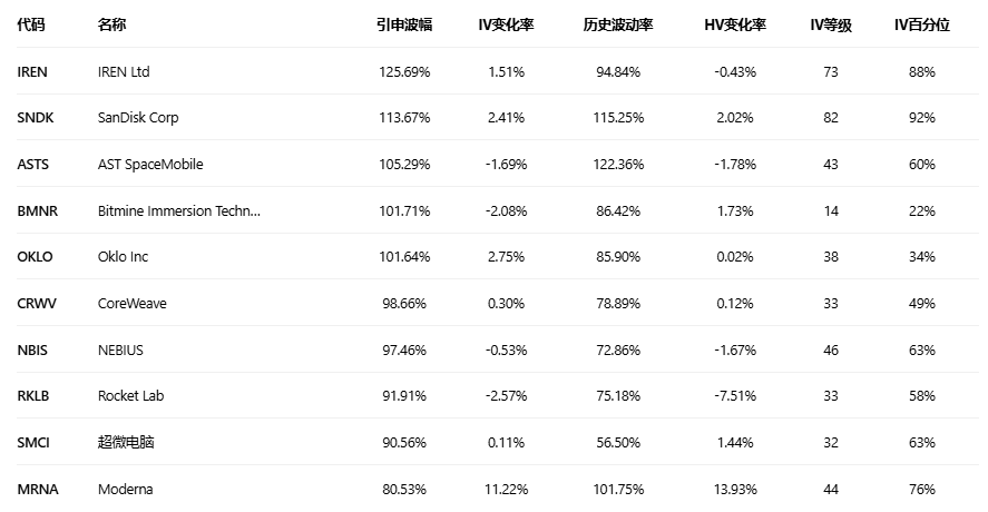 IREN Ltd隐含波动率最高,达到125.69%,较上一交易日增长1.51%。IREN股价因比特币跌破9万美元及美欧贸易紧张局势而下跌超6%,同时公司获得微软97亿美元五年期云服务合同,预计2026年4月新增1.4吉瓦产能上线。