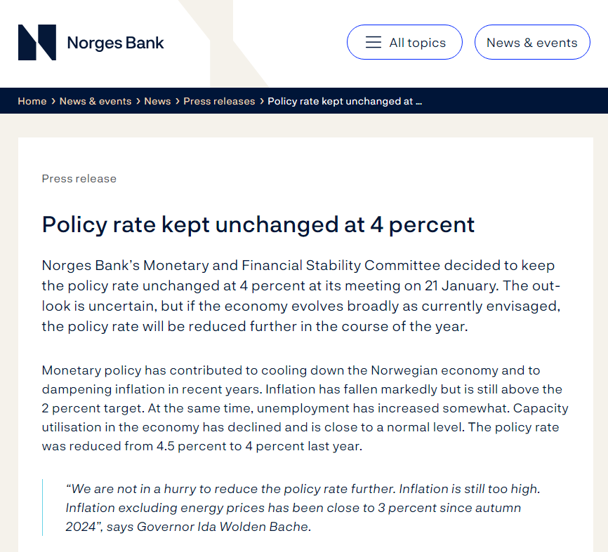 挪威央行1月22日宣布,将基准利率维持在4%的水平不变。该央行继续暗示不急于降低借贷成本,因为通胀仍然过高,令人不安。自2024年秋季以来,该国不包括能源价格在内的通货膨胀率已接近3%。