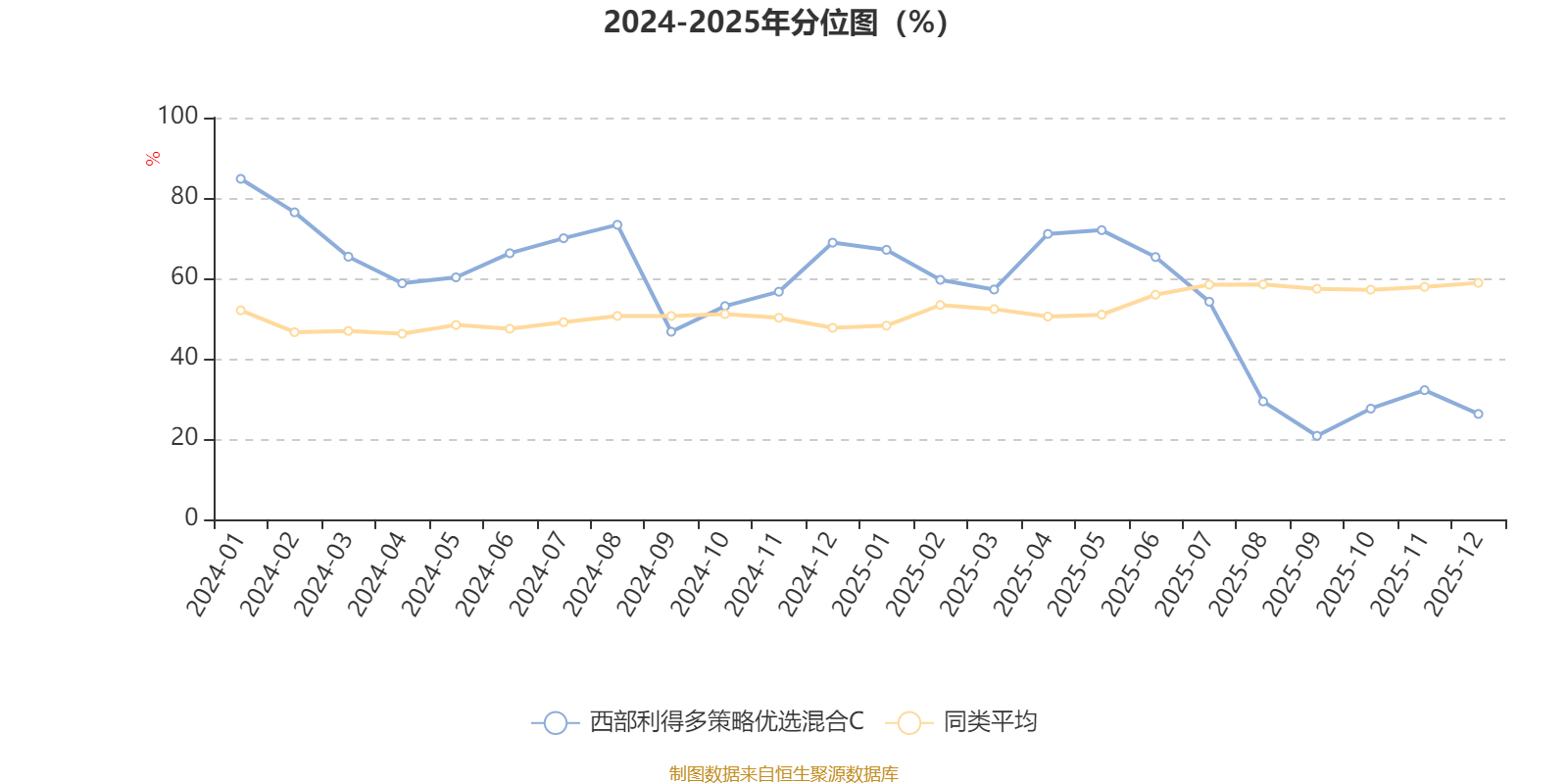 通过所选区间该基金净值增长率分位图,可以观察该基金与同类基金业绩比较情况。图为坐标原点到区间内某时点的净值增长率在同类基金中的分位数。