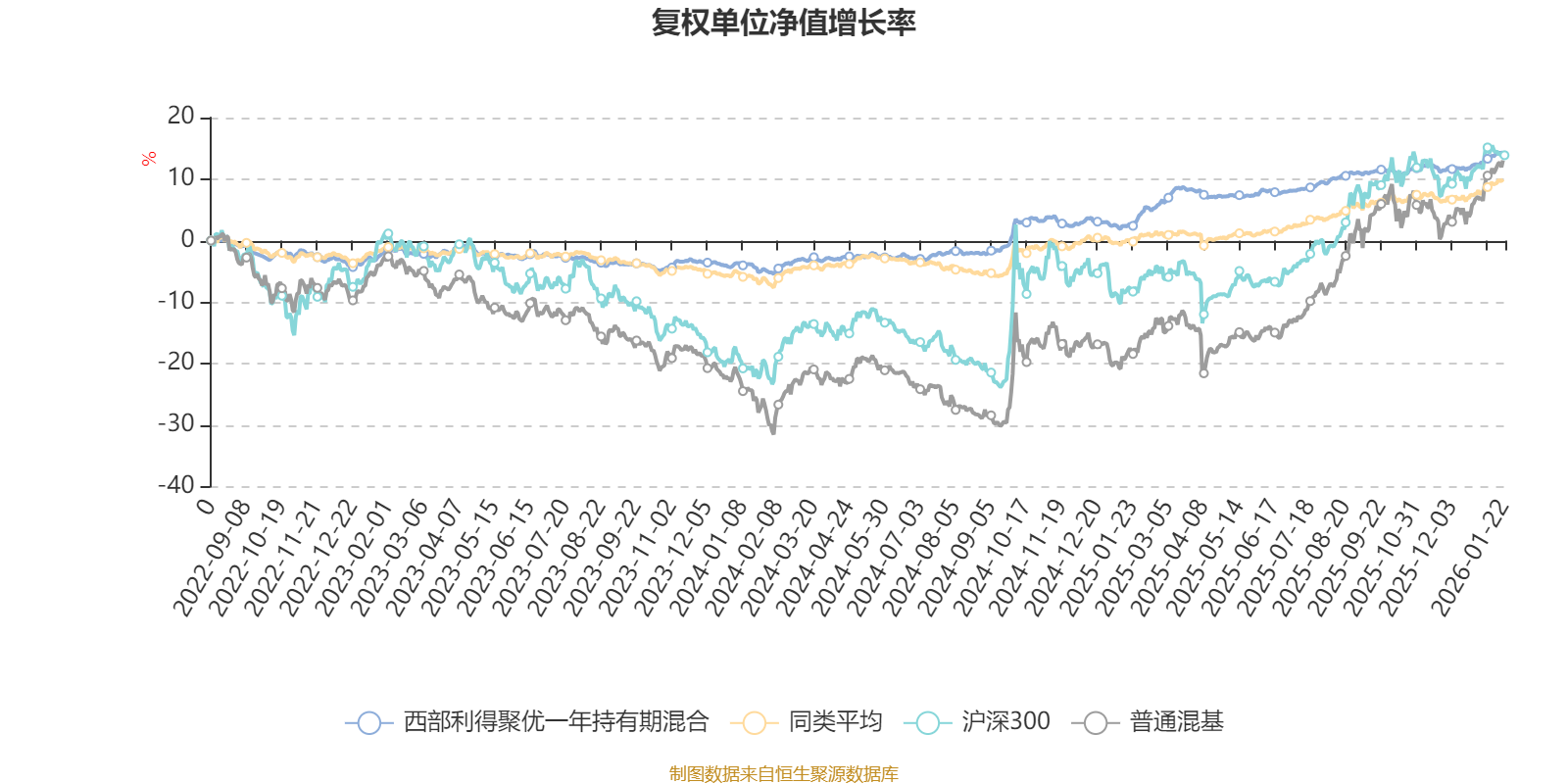 截至1月21日,西部利得聚优一年持有期混合近三个月复权单位净值增长率为3.12%,位于同类可比基金167/629;近半年复权单位净值增长率为5.25%,位于同类可比基金261/629;近一年复权单位净值增长率为11.41%,位于同类可比基金156/626;近三年复权单位净值增长率为16.80%,位于同类可比基金142/564。