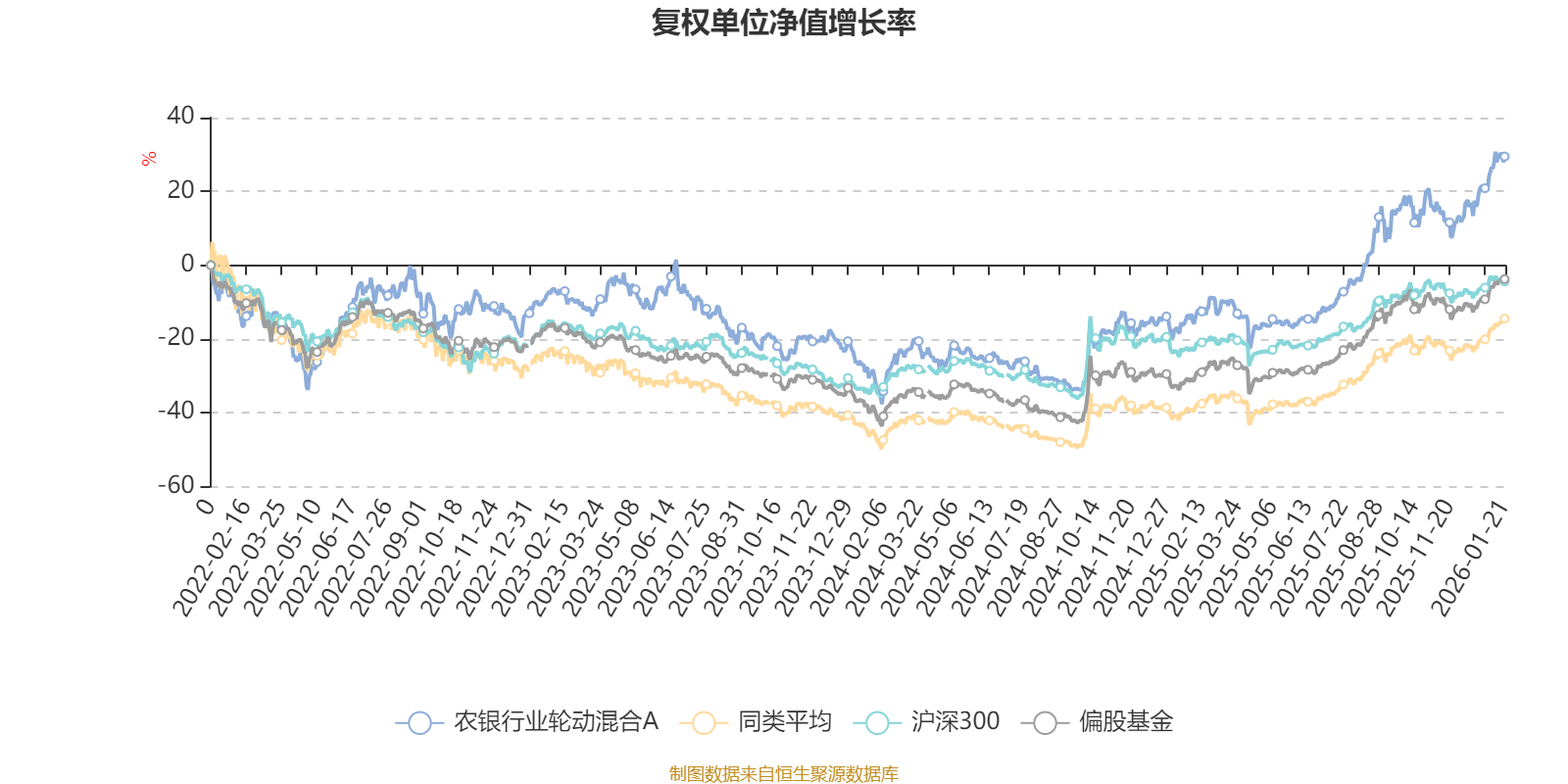 截至1月21日,农银行业轮动混合A近三个月复权单位净值增长率为12.48%,位于同类可比基金151/621;近半年复权单位净值增长率为39.52%,位于同类可比基金119/621;近一年复权单位净值增长率为49.62%,位于同类可比基金189/613;近三年复权单位净值增长率为40.54%,位于同类可比基金98/535。