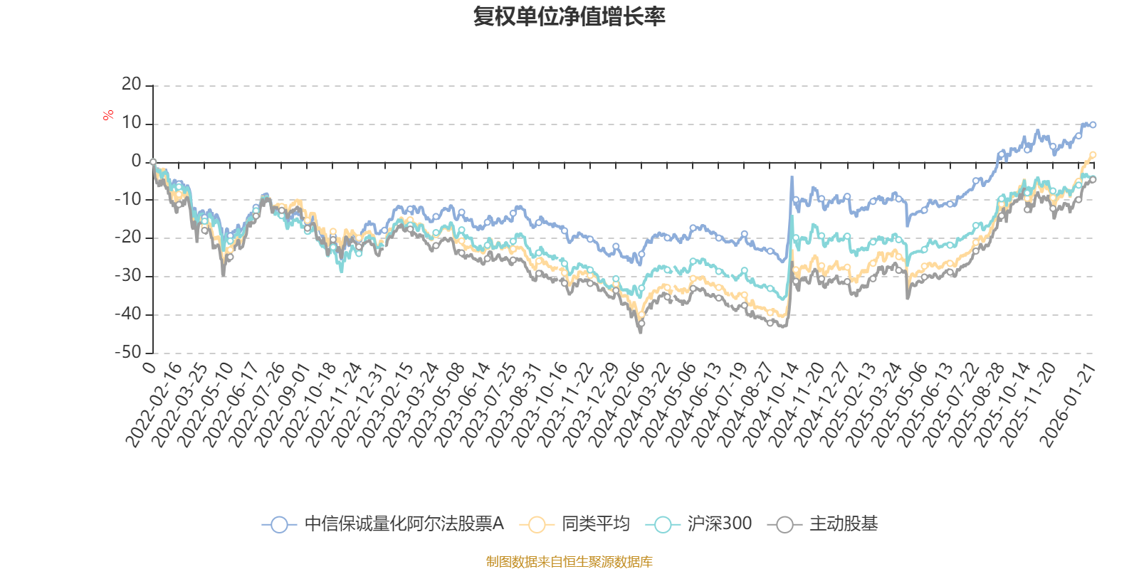 截至1月21日,中信保诚量化阿尔法股票A近三个月复权单位净值增长率为4.63%,位于同类可比基金130/167;近半年复权单位净值增长率为16.28%,位于同类可比基金130/167;近一年复权单位净值增长率为24.60%,位于同类可比基金136/165;近三年复权单位净值增长率为24.20%,位于同类可比基金78/156。