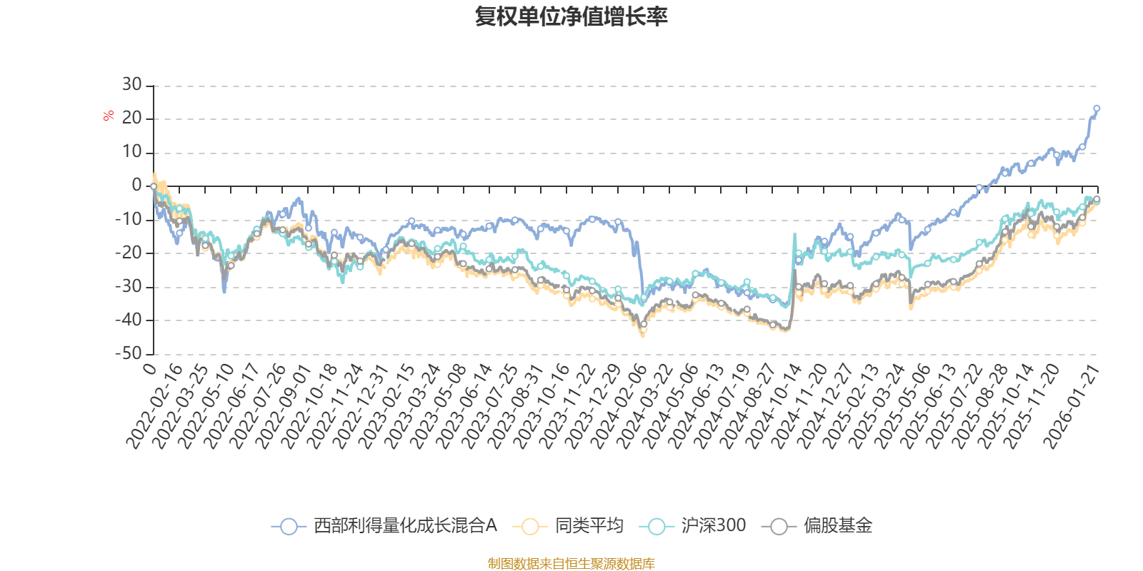 截至1月21日,西部利得量化成长混合A近三个月复权单位净值增长率为14.33%,位于同类可比基金48/264;近半年复权单位净值增长率为24.41%,位于同类可比基金141/264;近一年复权单位净值增长率为48.32%,位于同类可比基金81/264;近三年复权单位净值增长率为42.13%,位于同类可比基金49/255。