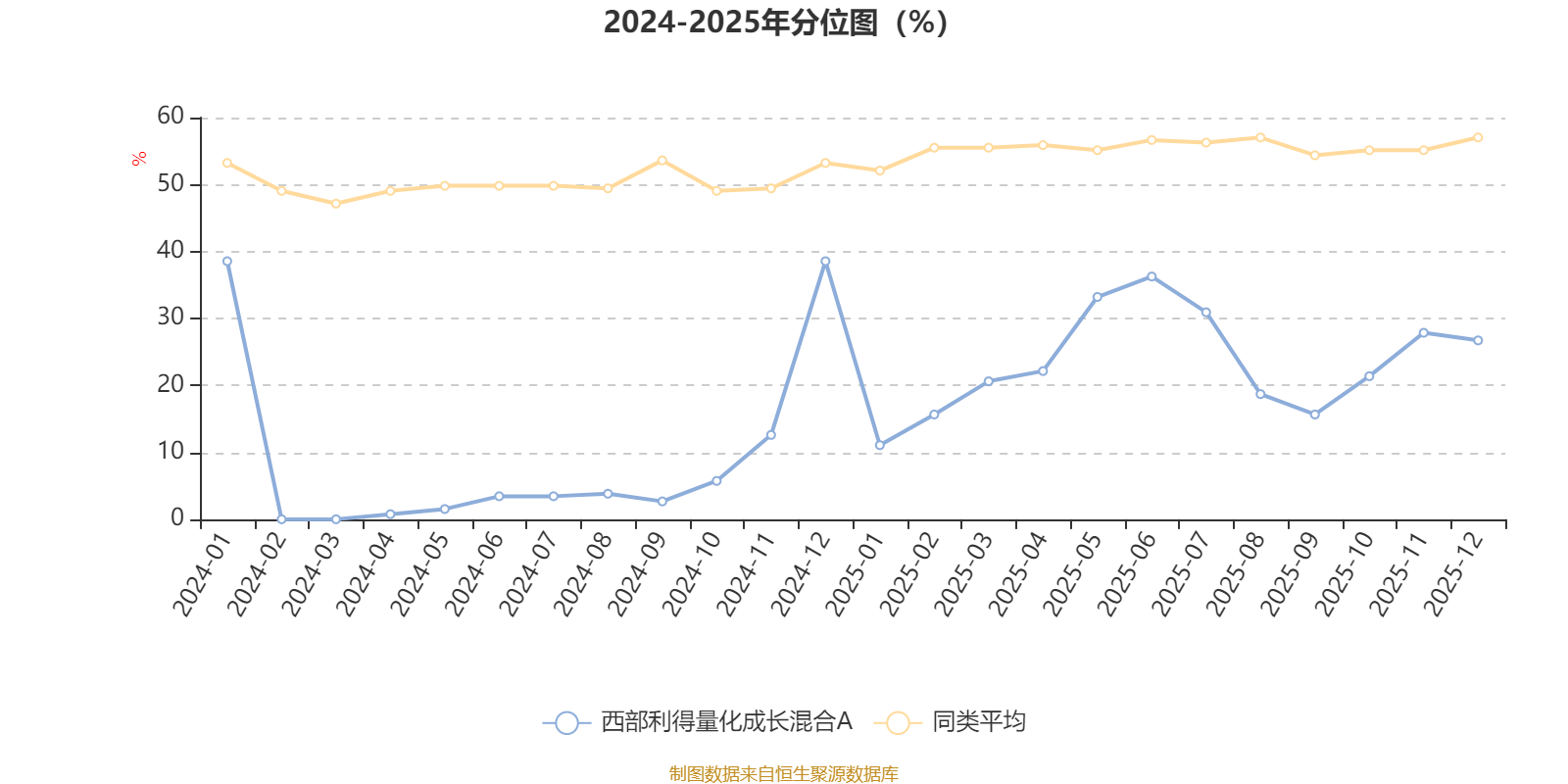 通过所选区间该基金净值增长率分位图,可以观察该基金与同类基金业绩比较情况。图为坐标原点到区间内某时点的净值增长率在同类基金中的分位数。