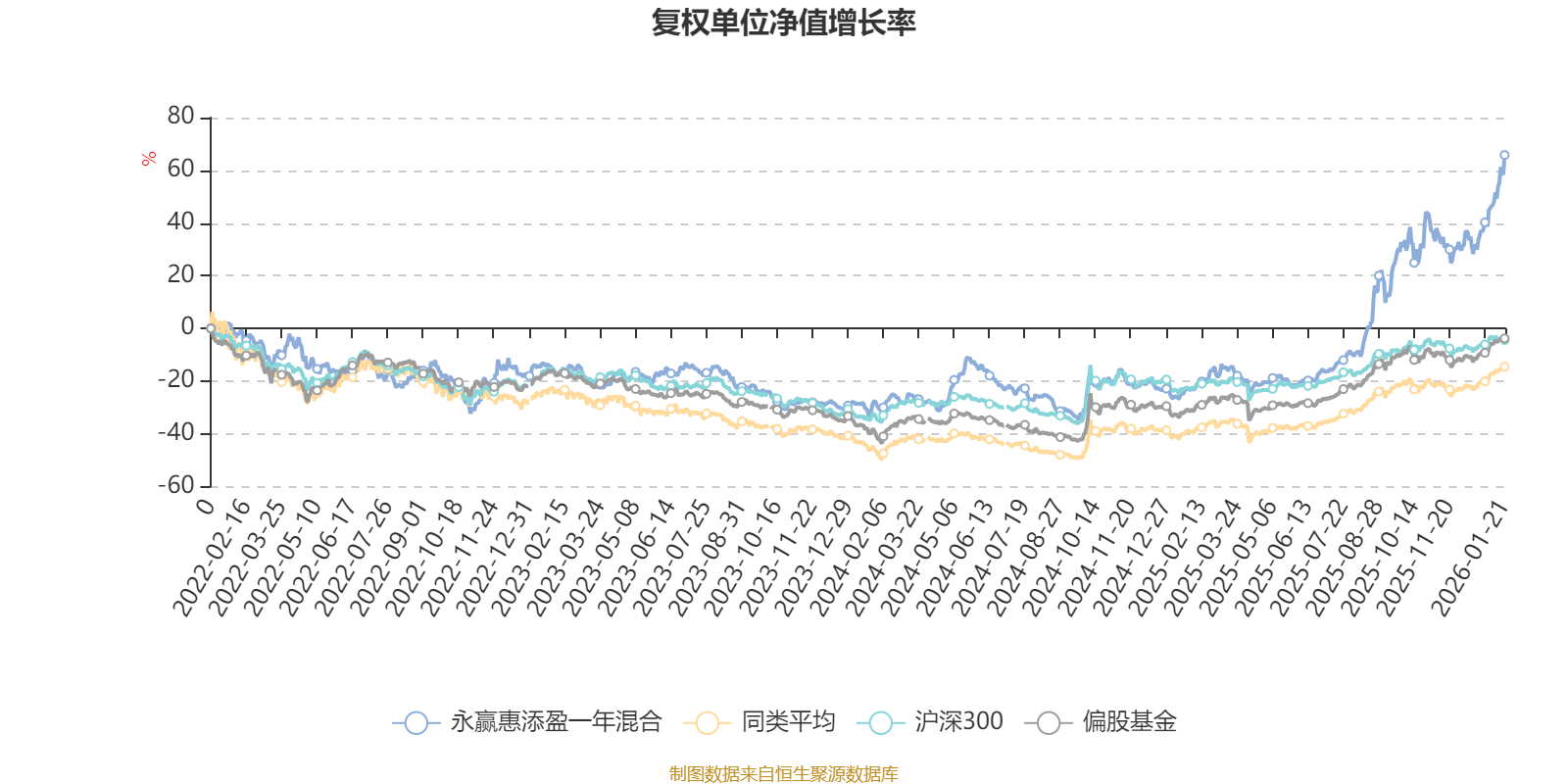 截至1月21日,永赢惠添盈一年混合近三个月复权单位净值增长率为25.67%,位于同类可比基金14/621;近半年复权单位净值增长率为88.81%,位于同类可比基金1/621;近一年复权单位净值增长率为114.17%,位于同类可比基金5/613;近三年复权单位净值增长率为92.10%,位于同类可比基金15/535。