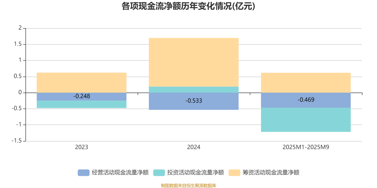 2025年1月至9月,公司经营活动现金流净额为-4694.5万元,同比增加1054.1万元;筹资活动现金流净额6172.9万元,同比减少2130.8万元;投资活动现金流净额-7471.5万元,上年同期为2135.2万元。