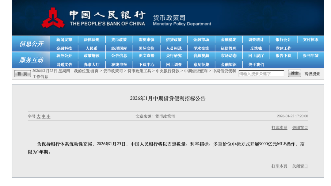 1月22日,央行发布消息称,为保持银行体系流动性充裕,1月23日,中国人民银行将以固定数量、利率招标、多重价位中标方式开展9000亿元中期借贷便利(MLF)操作,期限为1年期。