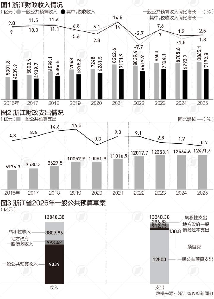 经济大省浙江的财政收入(即地方一般公共预算收入)近年稳居全国第三(仅次于广东、江苏)。随着近期浙江2025年全省和省级预算执行情况及2026年全省和省级预算(下称“预算报告”)获通过,浙江2025年财政收支状况和2026年财政收支预期逐步明晰。