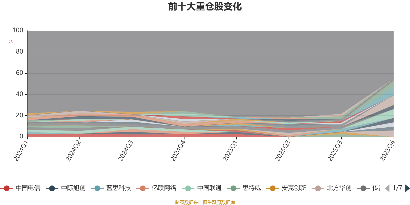 截至2025年四季度末,基金十大重仓股分别是寒武纪、东方财富、中芯国际、海光信息、北方华创、汇川技术、兆易创新、澜起科技、中科曙光、道通科技。