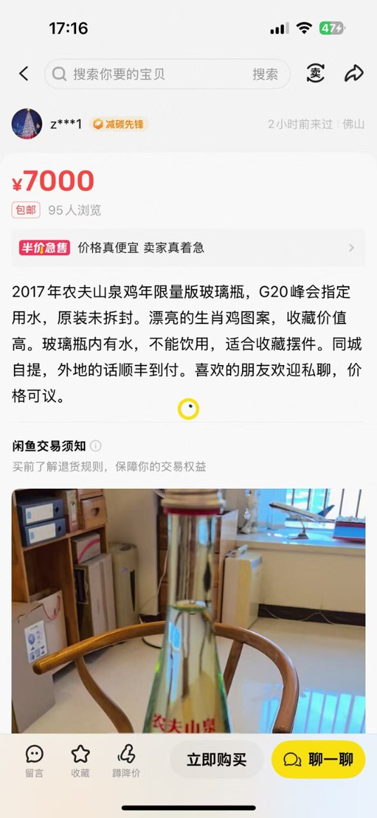 与此同时,另一卖家页面标注 “半价急售”,报价7000元,推出的是鸡年限量版生肖玻璃瓶装产品,标注原装未拆封。