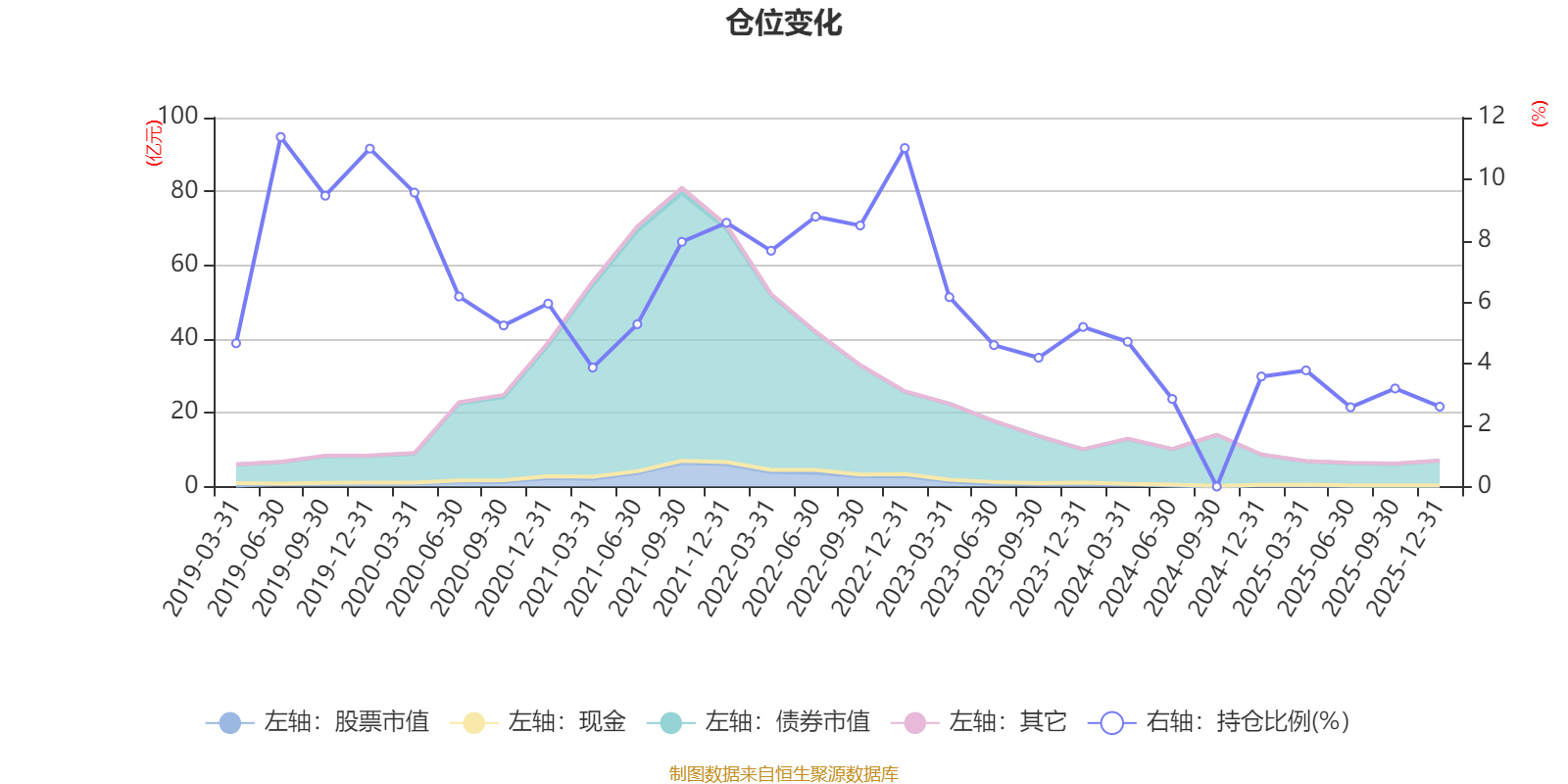 据定期报告数据统计,近三年平均股票仓位为3.62%,同类平均为72.57%。2019年上半年末基金达到11.37%的最高仓位,2025年上半年末最低,为2.58%。