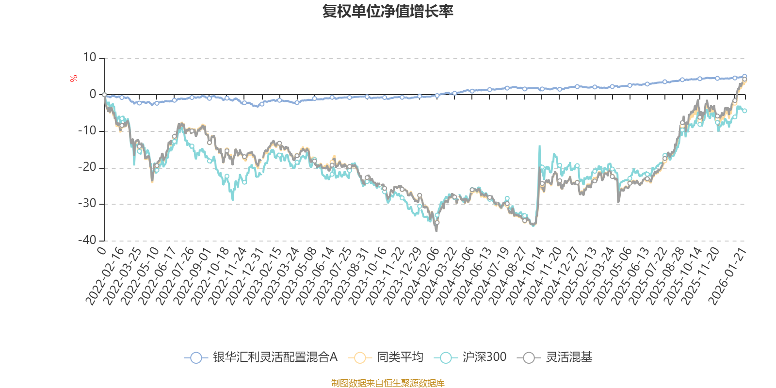 截至1月21日,银华汇利灵活配置混合A近三个月复权单位净值增长率为0.60%,位于同类可比基金1133/1286;近半年复权单位净值增长率为1.50%,位于同类可比基金1198/1286;近一年复权单位净值增长率为3.01%,位于同类可比基金1243/1286;近三年复权单位净值增长率为6.74%,位于同类可比基金878/1286。