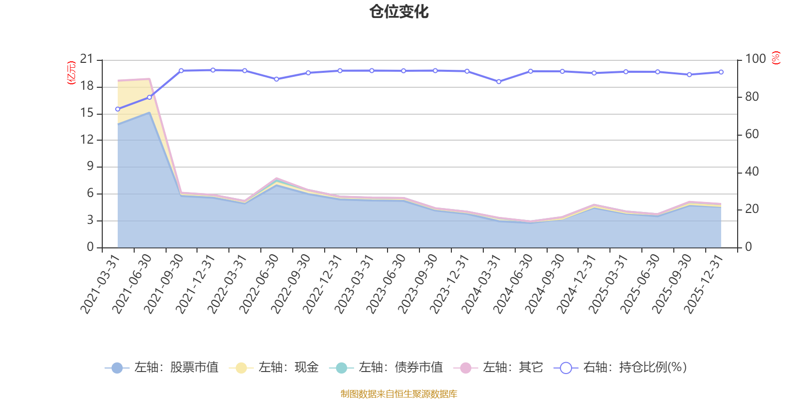 据定期报告数据统计,近三年平均股票仓位为93.23%,同类平均为86.9%。2021年末基金达到94.55%的最高仓位,2021年一季度末最低,为73.79%。