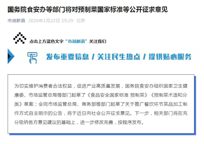 中新网1月22日电据“市说新语”微信公众号消息,为切实维护消费者合法权益,促进产业高质量发展,国务院食安办组织国家卫生健康委、市场监管总局等部门起草了《食品安全国家标准预制菜》《预制菜术语和分类》草案;会同市场监管总局、商务部等部门起草了关于推广餐饮环节菜品加工制作方式自主明示的公告,将于近日向社会公开征求意见。下一步,相关部门将在充分吸纳各方意见建议的基础上,进一步修改完善,按程序发布。