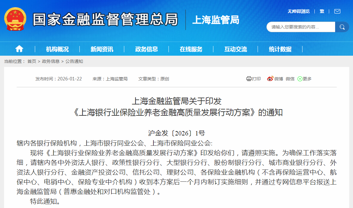 1月22日,记者从上海金融监管局获悉,为积极应对人口老龄化问题挑战,推动“十五五”时期上海地区养老金融高质量发展,该局印发《上海银行业保险业养老金融高质量发展行动方案》(下称《行动方案》),围绕建设养老保障体系、强化养老产业支持、满足老年群体金融需求、健全金融机构内部治理架构、加强业务监管和构建协作机制等六大方面提出20条举措,着力构建具有上海特色的养老金管理体系、商业养老金融体系、养老产业融资和保险保障体系以及养老金融风险防控和监管体系。
