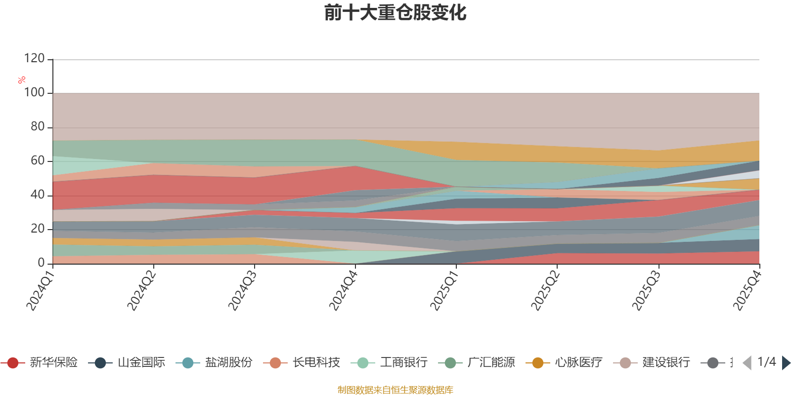 该基金持股集中度较高,近2年前十大重仓股集中度长期超过60%。截至2025年四季度末,基金十大重仓股分别是赤峰黄金、三一重工、盐湖股份、新华保险、山金国际、山东黄金、恒瑞医药、博源化工、招商蛇口、中国平安。