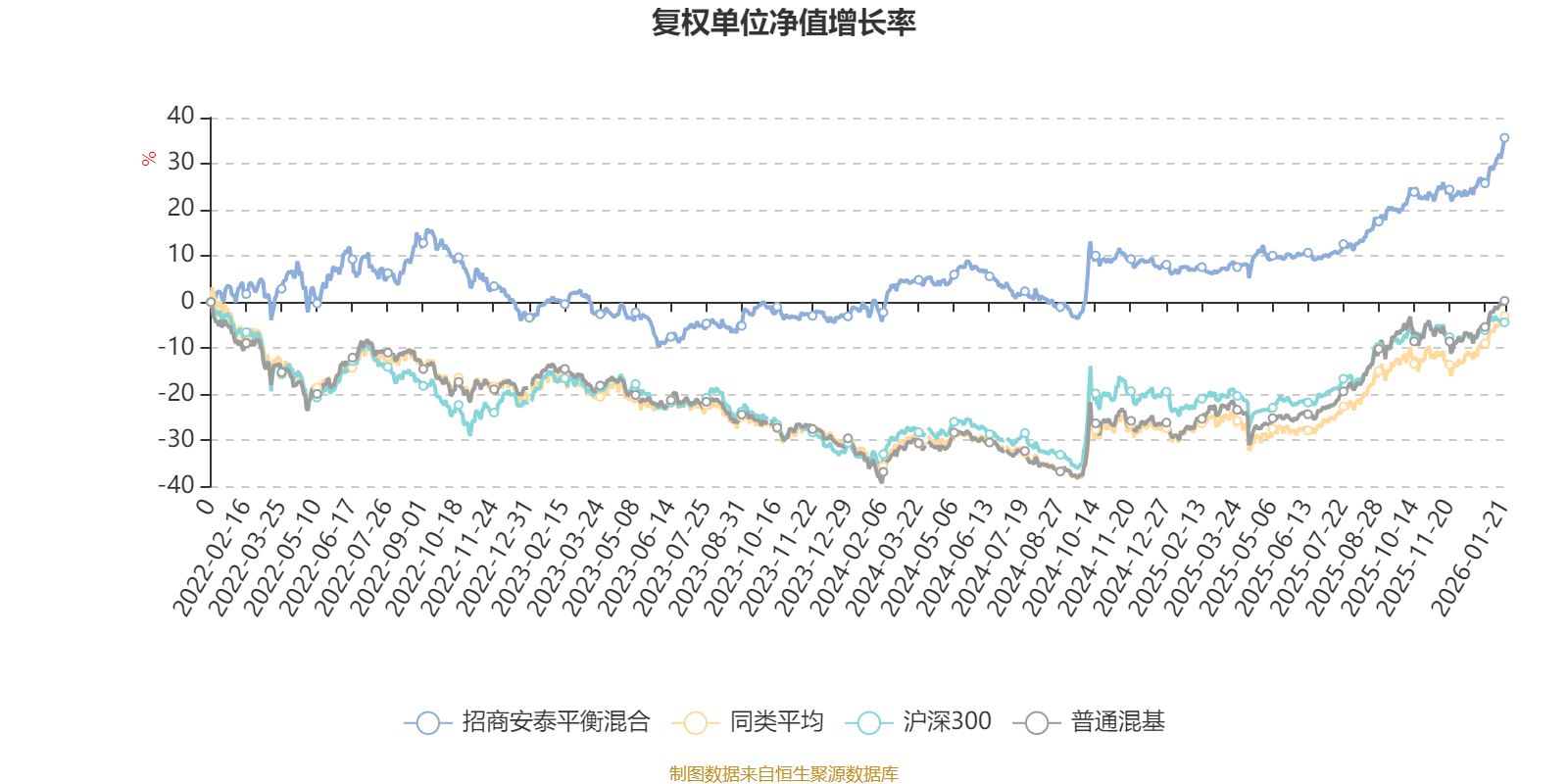 截至1月21日,招商安泰平衡混合近三个月复权单位净值增长率为10.28%,位于同类可比基金52/134;近半年复权单位净值增长率为21.64%,位于同类可比基金60/134;近一年复权单位净值增长率为25.82%,位于同类可比基金72/131;近三年复权单位净值增长率为34.77%,位于同类可比基金29/124。