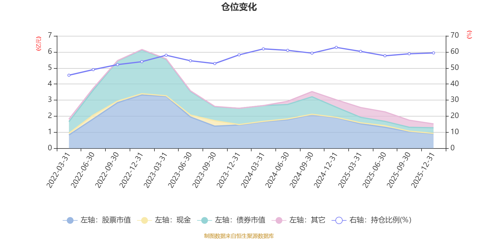 据定期报告数据统计,近三年平均股票仓位为58.71%,同类平均为67.52%。2024年末基金达到62.82%的最高仓位,2022年一季度末最低,为45.5%。