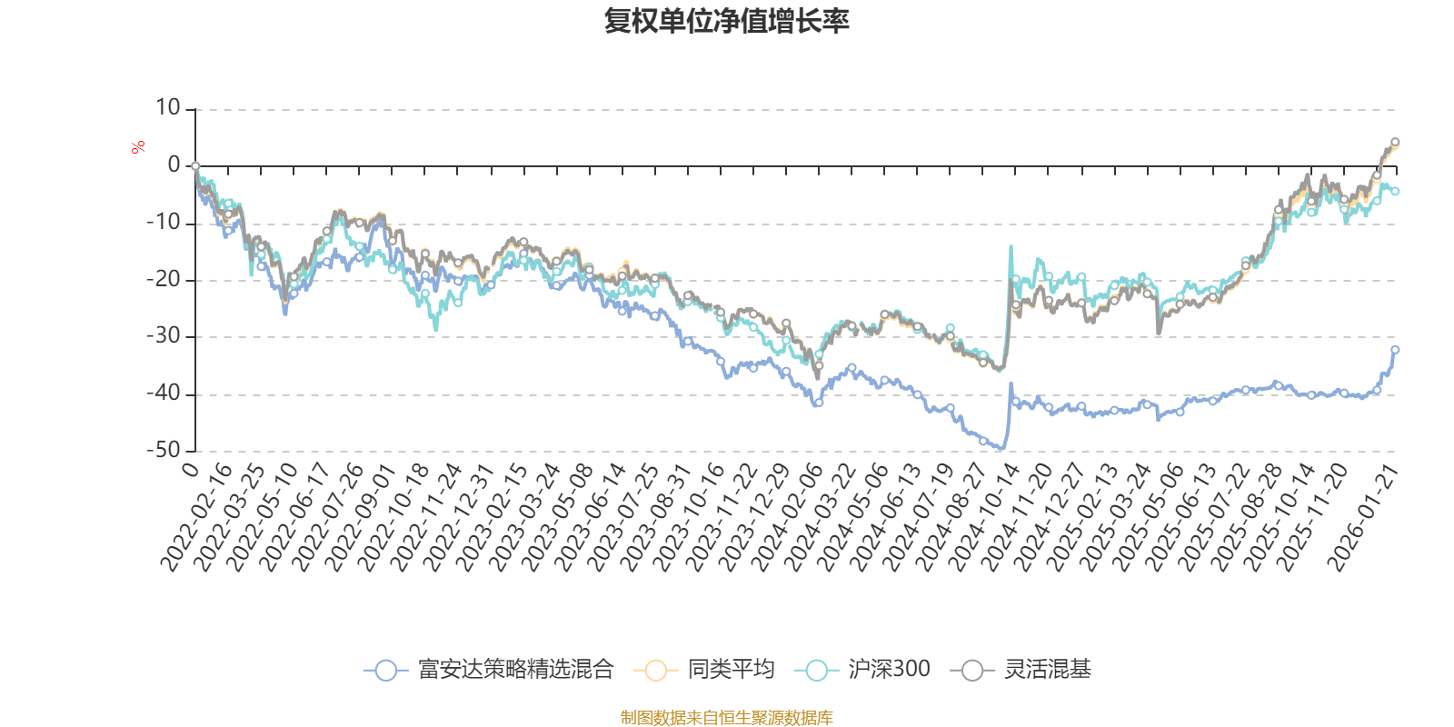 截至1月21日,富安达策略精选混合近三个月复权单位净值增长率为13.28%,位于同类可比基金329/1286;近半年复权单位净值增长率为11.66%,位于同类可比基金906/1286;近一年复权单位净值增长率为19.22%,位于同类可比基金917/1286;近三年复权单位净值增长率为-18.04%,位于同类可比基金1210/1286。