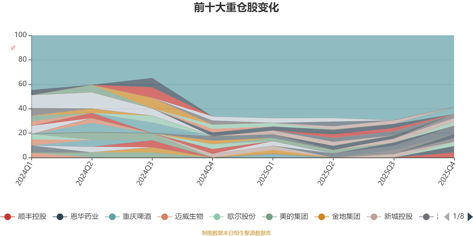 截至2025年四季度末,基金十大重仓股分别是恒瑞医药、上海机场、恩华药业、顺丰控股、歌尔股份、明阳智能、伊利股份、当升科技、海大集团、东方电缆。