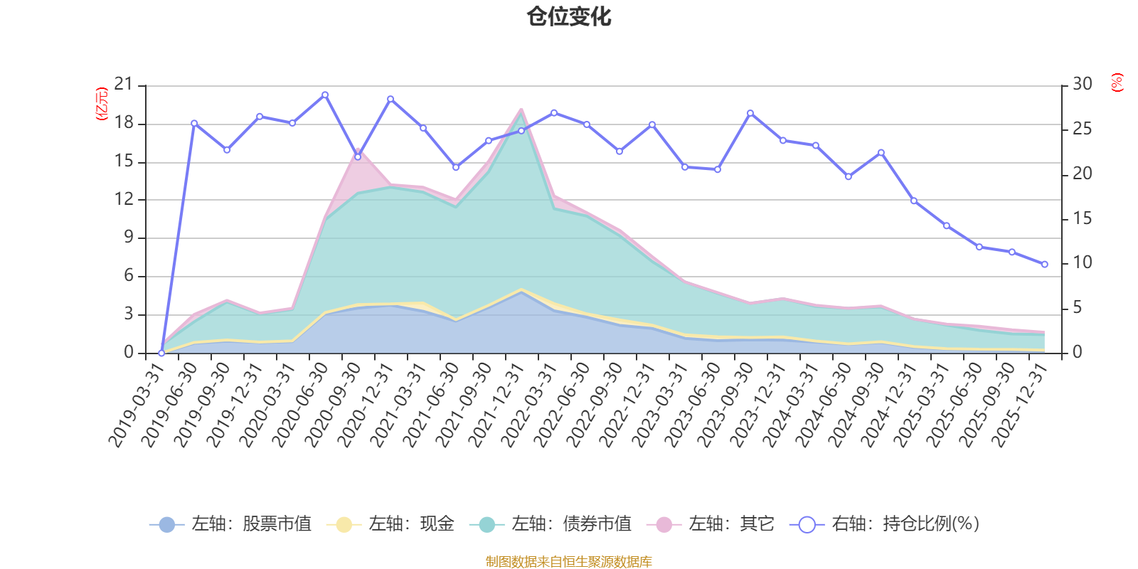 据定期报告数据统计,近三年平均股票仓位为18.52%,同类平均为19.2%。2020年上半年末基金达到28.94%的最高仓位,2025年末最低,为9.95%。